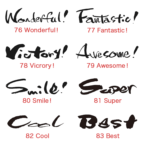 伝えたい想いをCoolに表現。評価や感激をあらわす英単語を筆文字にした、和洋折衷のスタンプです。